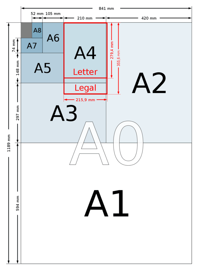 La medida de una hoja de papel tamaño A4 en pulgadas es 11,69291×8,26772″ 29,7cmx21cm con lo que demuestra que el a4 no es una traducción de una medida en pulgadas porque es un número con 5 decimales.