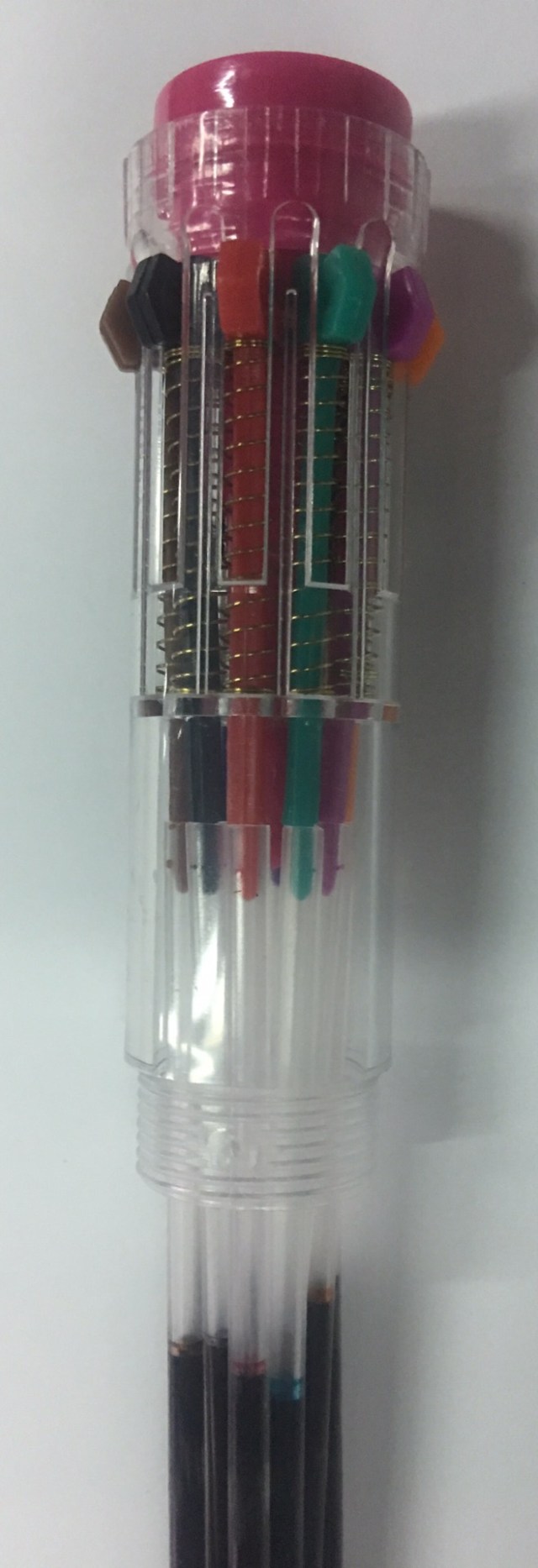 Un boli en plástico de colores fáciles de sacar y luego apretando el botón se recogen todos rápido y sencillamente.