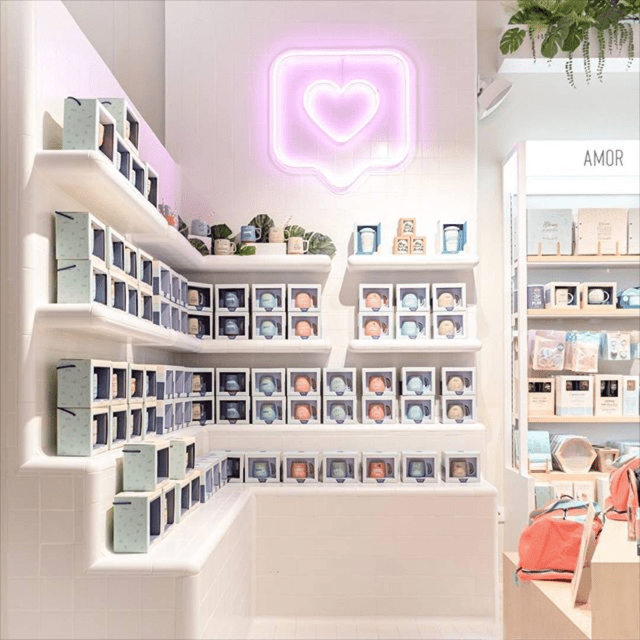Con frases motivadoras, le vegetación y el color. Y, lógicamente, en ella se pueden adquirir todos los productos que han convertido a la marca en un fenómeno mundial, como sus célebres tazas, agendas, mochilas o paraguas…