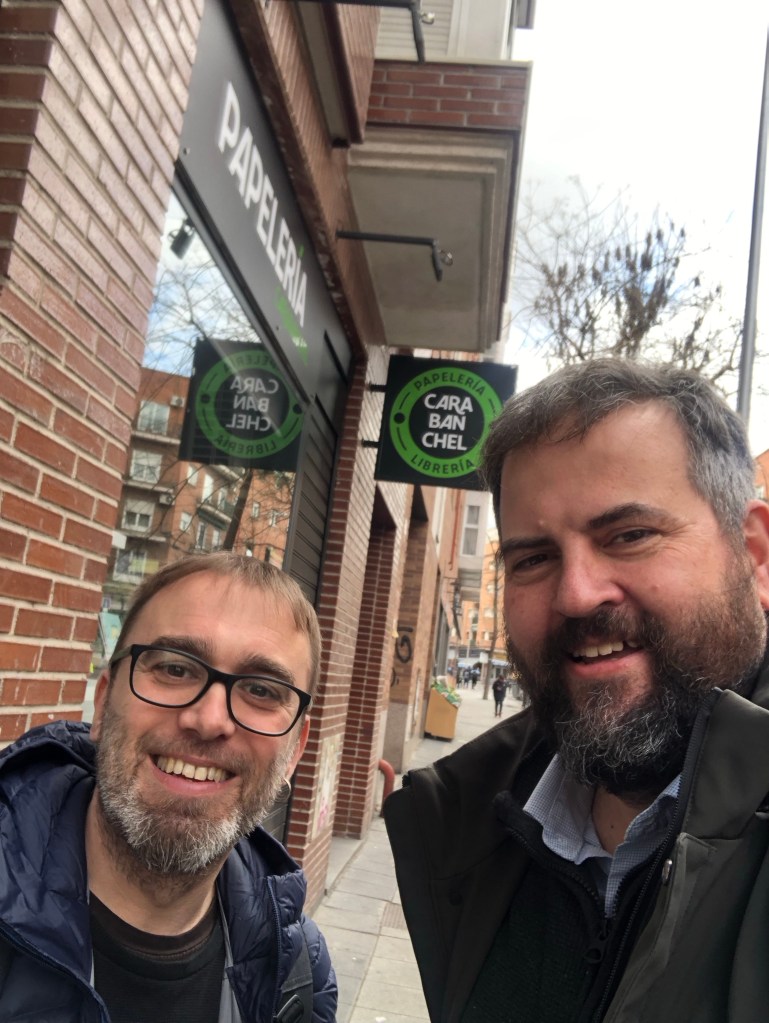 Quedamos en su papelería en la calle P.º de Marcelino Camacho, 19, en Madrid, a las 13:30 cuando cierra al medio día, un librero-papelero atados al horario de nuestro comercio, sobre todo como en su caso que esta el sólo en la tienda. Ya me había advertido que iríamos a llevar un pedido a un cliente andando, … lo que me pareció un detalle muy bueno, al igual que yo … hacemos de todo, y que tuviera la confianza de ir conmigo… tal y como somos los papeleros.. pequeñitos. Lo que hacen rentables nuestros negocios es esto, hacer de todo y aprovechar cada minuto para que salgan las cuentas a final de mes. Fue una gozada compartir una hora con él y hablar de papelería, una persona igual que sus videos una persona directa que dice lo que piensa del mundo de la papelería.