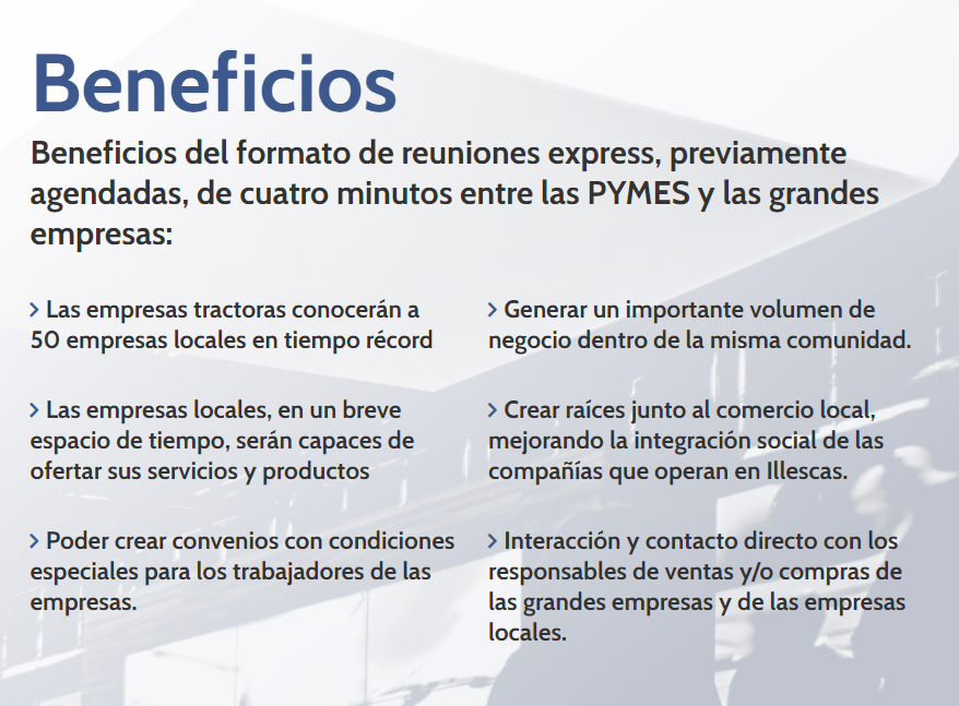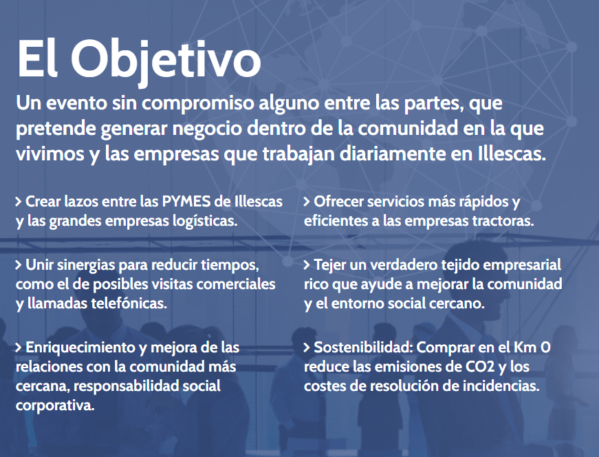 Consistirá en reuniones de 4 minutos para presentar tu a tu mi empresa sin intermediarios, ni bonitas palabras mirando a los ojos y con muchas ganas de aprender y hacer negocios juntos. Creo que en muchas de las memorias empresariales de esas grandes compañías esta una responsabilidad social corporativa con la comunidad, una sostenibilidad donde comprar en el km 0 estoy seguro que aminora sin ninguna duda la huella de carbono y muchas más ventajas que les podemos ofrecer cualquiera de las pymes Illescanas.