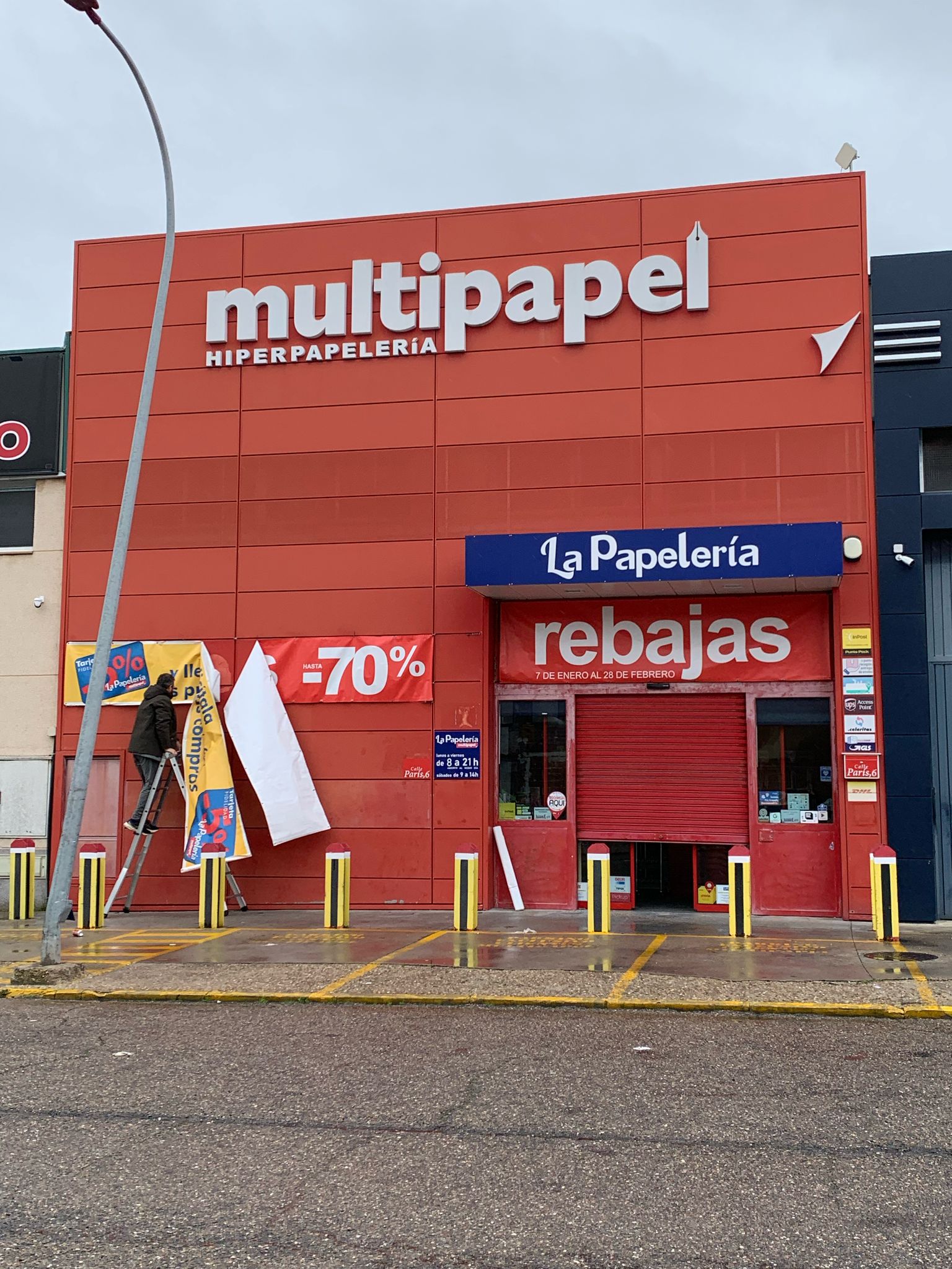 Si ampliais bien la imagen de la foto, me encotrareis a mi hoy domingo dos de marzo de 2025, trabajando quitando la lona de las rebajas de mi tienda La Papelería Multipapel. No soy ningún heroe por trabajar un domingo, hay mucha gente que lo hace y en condiciones más duras que yo.